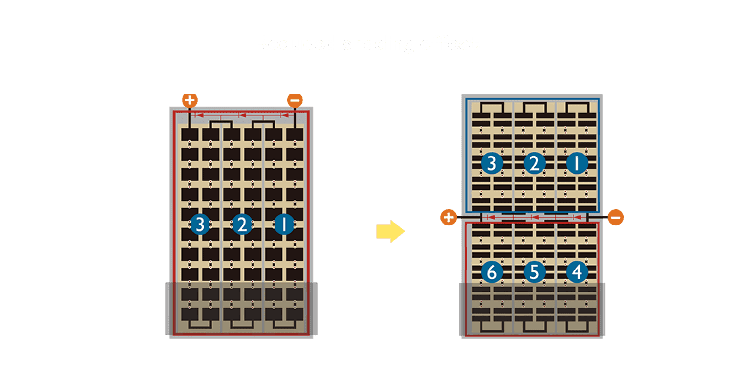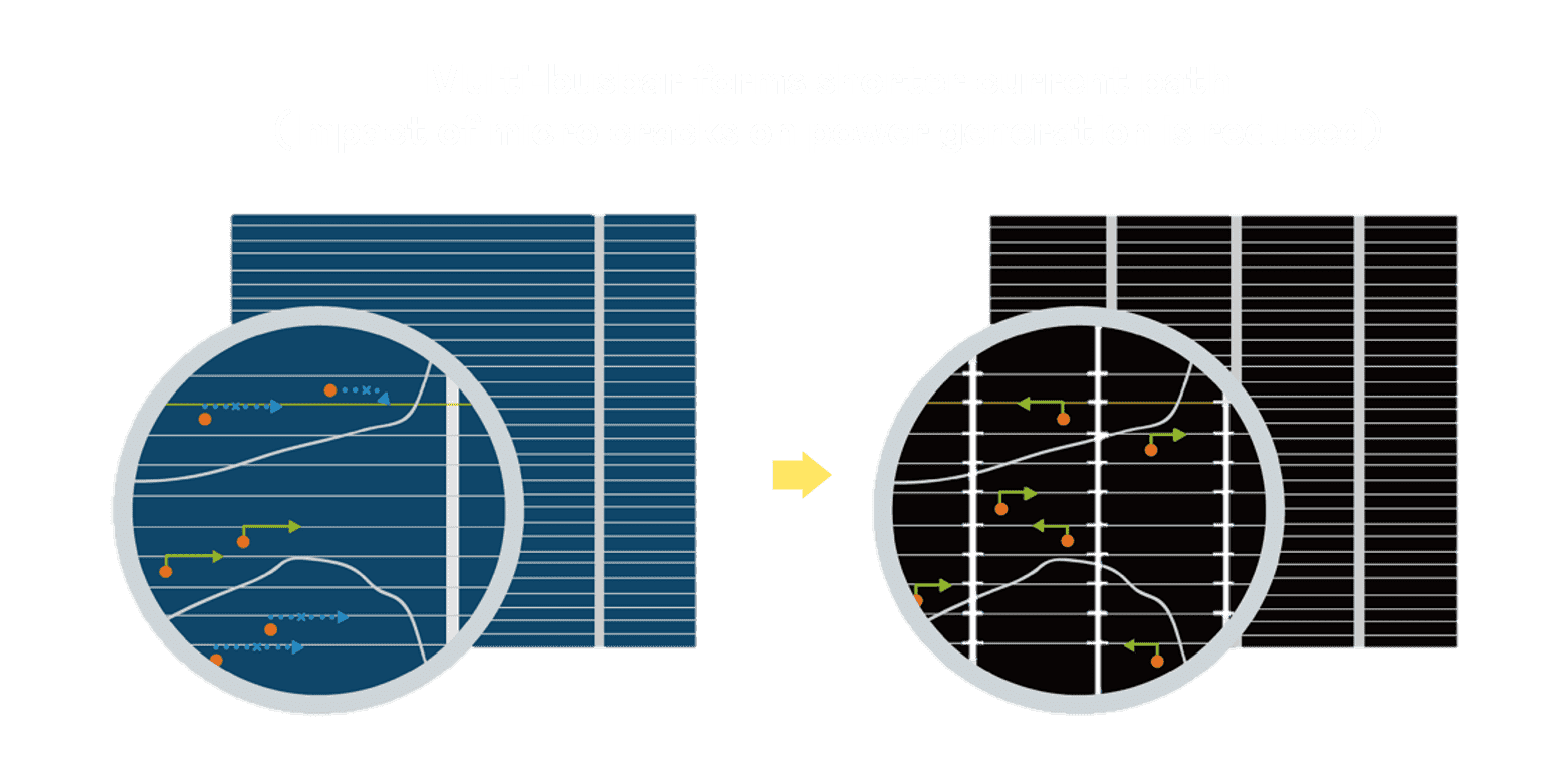 - 电池使用多条铜导线 (Copper wire) 于电池片上形成较短的电流路径,,,提高电流收集效率,,,,采用圆形设计的铜导线较传统扁平式的铜焊带 (Ribbon),,,,可增加入射至电池的光线量。。。。