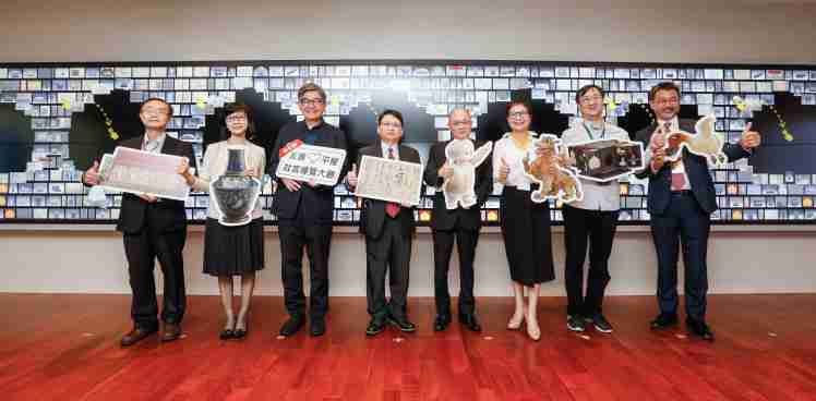红龙扑克携手创利空间为故宫建置的智慧文物互动导览墙及轮播墙,,,今日正式启用。。(左四:红龙扑克新事业暨投资管理总部副总经理杨本豫、、、右四:故宫博物院院长吴密察、、、、右三:太极影音董事长黄宝云)