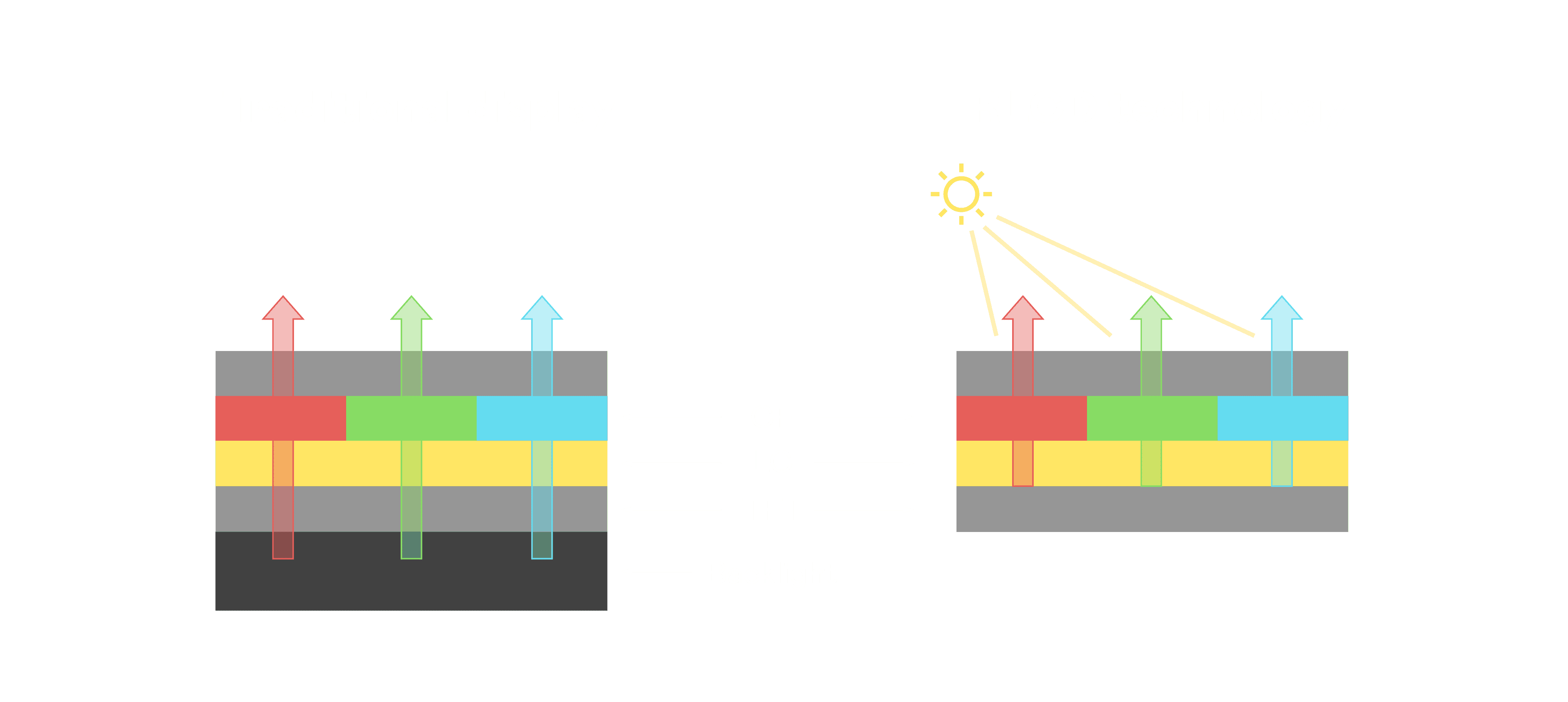 与传统需搭配背光单元的液晶显示相比,,,反射式液晶技术不仅更省电、、、、更轻薄,,,,且即便在艳阳下仍能清晰显示。。此外,,,,少了背光单元,,,,也大幅降低了 LED 蓝光伤害眼睛的疑虑。。。